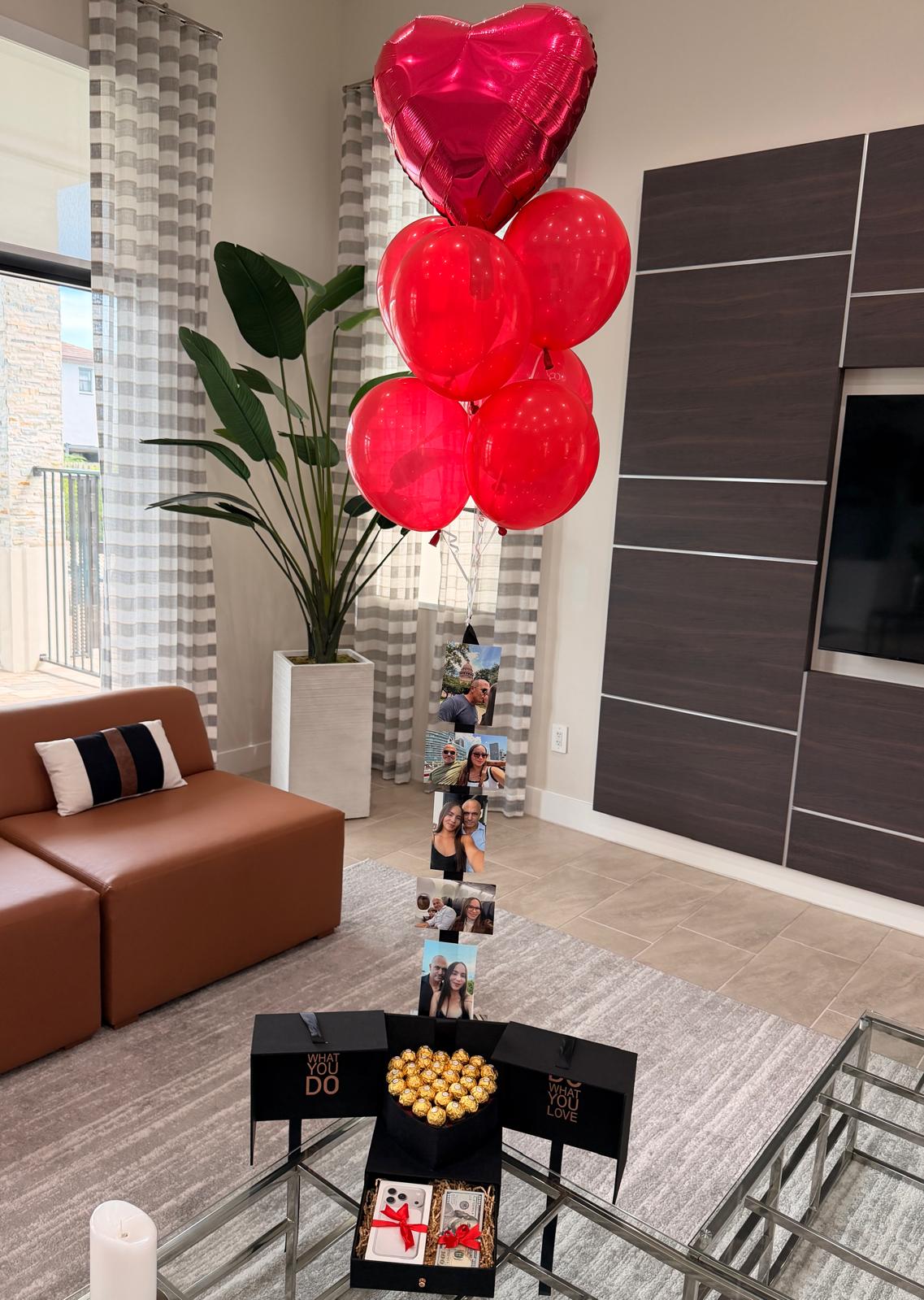 Includes a metallic heart-shaped balloon and red helium balloons to create a special surprise effect.